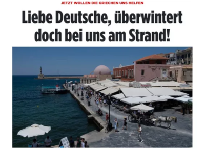 Αγαπητοί Γερμανοί, ξεχειμωνιάστε σε μας, στην παραλία!». Με αυτόν τον τίτλο η εφημερίδα BILD αναφέρεται σε σχετική πρόσκληση του υπουργού Τουρισμού σε συνταξιούχους από τη Γερμανία να περάσουν στην Ελλάδα τον δύσκολο χειμώνα που έρχεται.