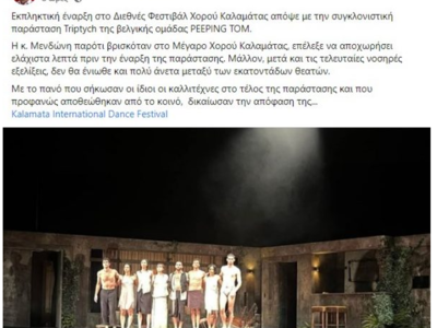 Σε σχετική ανάρτηση στο Facebook, ο Αλέξης Χαρίτσης, βουλευτής του ΣΥΡΙΖΑ-Π.Σ., έγραψε για την παράσταση ενώ σχολίασε και την απουσία της κ. Μενδώνη: «Εκπληκτική έναρξη στο Διεθνές Φεστιβάλ Χορού Καλαμάτας απόψε με τη συγκλονιστική παράσταση «Triptych» της βελγικής ομάδας «Peeping Tom». Η κ. Μενδώνη παρότι βρισκόταν στο Μέγαρο Χορού Καλαμάτας, επέλεξε να αποχωρήσει ελάχιστα λεπτά πριν από την έναρξη της παράστασης. Μάλλον, μετά και τις τελευταίες νοσηρές εξελίξεις, δεν θα ένιωθε και πολύ άνετα μεταξύ των εκατοντάδων θεατών. Με το πανό που σήκωσαν οι ίδιοι οι καλλιτέχνες στο τέλος της παράστασης και που προφανώς αποθεώθηκαν από το κοινό, δικαίωσαν την απόφαση της…».