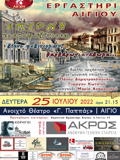Το Χορευτικό Εργαστήρι Αιγίου, τη Δευτέρα 25 Ιουλίου, ώρα 9.15 το βράδυ, στο ανοιχτό θέατρο Γ. Παππάς στο Αίγιο, θα παρουσιάσει στο κοινό της Αιγιάλειας μια πολυδιάστατη παράσταση για τα 100 χρόνια μνήμης από την καταστροφή της Σμύρνης, μέσα από τραγούδια, μουσική, χορό, εικόνες και λόγο, με τη συμμετοχή 50 χορευτών, αφηγητών και οκταμελούς παραδοσιακής ορχήστρας με την μουσική επιμέλεια των Πάνου Δημητρακόπουλου και Γιώργου Κωτσίνη.