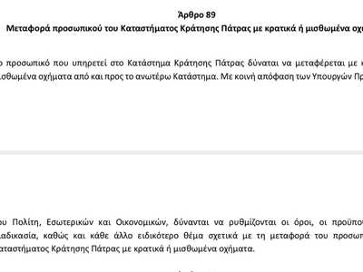 Με την ρύθμιση που κατατέθηκε στο κοινοβούλιο ως άρθρο 89 του νομοσχεδίου «Αναβάθμιση της αστυνομικής εκπαίδευσης, αναμόρφωση του πλαισίου οργάνωσης και λειτουργίας της Σχολής Αξιωματικών της Ελληνικής Αστυνομίας και άλλες ρυθμίσεις του Υπουργείου Προστασίας του Πολίτη» παρέχεται πλέον εξουσιοδότηση στους Υπουργούς Προστασίας του Πολίτη, Εσωτερικών και Οικονομικών, να ρυθμίζουν, με κοινή απόφασή τους, τους όρους, τις προϋποθέσεις, τη διαδικασία και κάθε άλλο θέμα σχετικό με τη δυνατότητα μετακίνησης του προσωπικού του Καταστήματος Κράτησης Πάτρας με κρατικά ή μισθωμένα οχήματα, με σκοπό την απρόσκοπτη λειτουργία της υπηρεσίας και την έγκαιρη προσέλευση των Υπαλλήλων στην Υπηρεσία, καθώς το ανωτέρω Κατάστημα εδρεύει εκτός της πόλης των Πατρών και δεν υπάρχουν τακτικά μέσα μαζικής μεταφοράς.