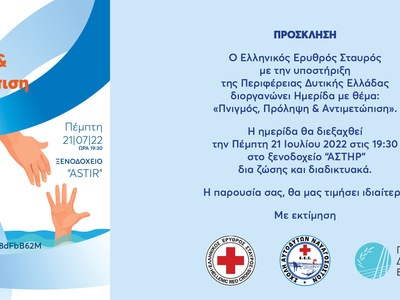 O Ελληνικός Ερυθρός Σταυρός σε συνεργασία με την Περιφέρεια Δυτικής Ελλάδας , με αφορμή την Παγκόσμια Ημέρα Πρόληψης Πνιγμών, διοργανώνει, την Πέμπτη 21 Ιουλίου 2022, στο ξενοδοχείο «ΑΣΤΗΡ» (Πάτρα) και ώρα 19:30, ενημερωτική ημερίδα για την πρόληψη & αντιμετώπιση των πνιγμών στην Ελλάδα.