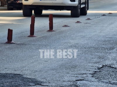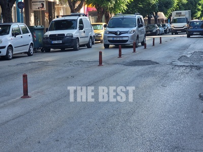 Βίδες εξέχουν τουλάχιστον έναν πόντο πάνω από την άσφαλτο και στη μέση του δρόμου. Είναι ότι απέμεινε από τις εύκαμπτες κορίνες, στην Έλληνος Στρατιώτου. Τις κορίνες που τοποθετήθηκαν για να μην διπλοπαρκάρουν οι οδηγοί ΙΧ αυτοκινήτων προκαλώντας μποτιλιάρισμα στον κεντρικό αυτό δρόμο.