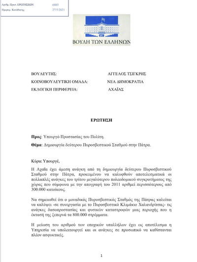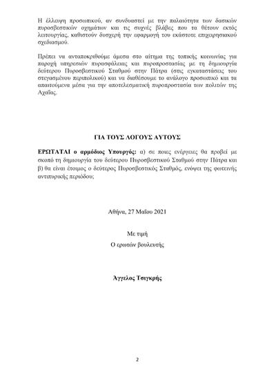Να σημειωθεί ότι ο Αχαιός βουλευτής στις 4.2.2020 είχε ζητήσει από τον Υπουργό Προστασίας του Πολίτη -από το βήμα της Ολομέλειας της Βουλής- τη δημιουργία δεύτερου Πυροσβεστικού Σταθμού στην Πάτρα, ενώ στις 27.5.2021 είχε καταθέσει και σχετική Ερώτηση στη Βουλή (Αριθμός πρωτοκόλλου: 6885 / 27.5.2021).