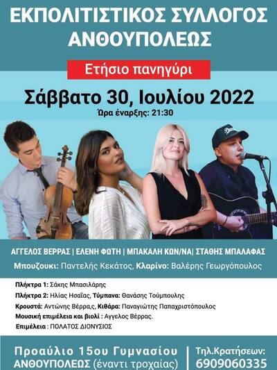 Ο Εκπολιτιστικός Σύλλογος Ανθουπόλεως Πατρών στo πλαίσιo των πολιτιστικών δράσεων θα πραγματοποιήσει το ετήσιο πανηγύρι του.