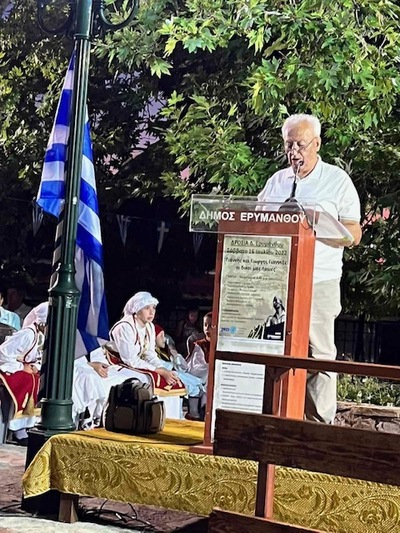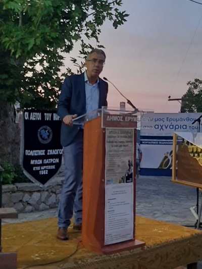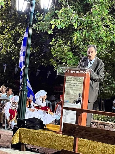 Χαιρετισμό στην εκδήλωση απηύθυναν ο Δήμαρχος Ερυμάνθου, Θόδωρος Μπαρής, ο οποίος υπενθύμισε πως στο ιστορικό λεύκωμα που εξέδωσε ο Δήμος περιλαμβάνονται