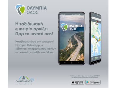 Η Ολυμπία Οδός, που πρώτη εφάρμοσε τη χιλιομετρική χρέωση διοδίων στην Ελλάδα, δημιούργησε και προσφέρει δωρεάν μια εφαρμογή για κινητά που σας επιτρέπει να προγραμματίζετε με μεγάλη ευκολία το ταξίδι σας, να εξερευνήσετε τόπους και διαδρομές και υπόσχεται να απογειώσει την ταξιδιωτική σας εμπειρία.