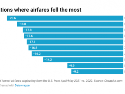 Με βάση την ανασκόπηση περισσότερων από 24 εκατομμυρίων αεροπορικών ναύλων αυτήν την άνοιξη, οι πτήσεις προς την Ευρώπη από Αμερικανικές πόλεις ανήλθαν κατά μέσο όρο στα 908 δολάρια φέτος, όταν το 2021 ήταν κατά μέσο όρο 1.070 δολάρια.