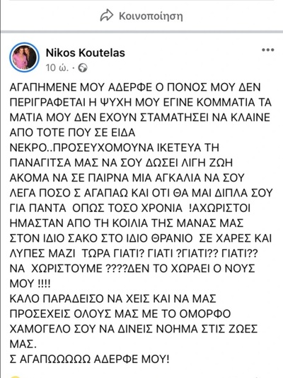 Έφυγε ξαφνικά από τη ζωή το μοντέλο Χρήστος Κουτέλας. Την είδηση έκανε γνωστή ο δίδυμος αδερφός του, Νίκος με μια σπαρακτική ανάρτηση στο Facebook.