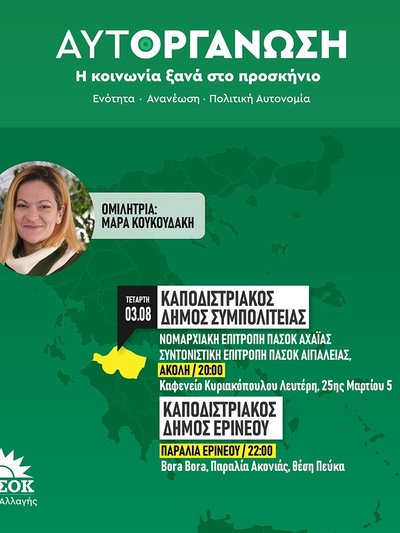 Η Νομαρχιακή Επιτροπή Αχαΐας ΠΑΣΟΚ- ΚΙΝΗΜΑ ΑΛΛΑΓΗΣ σε συνεργασία με την Δημοτική Συντονιστική Οργάνωση Δήμου Αιγιαλείας συνδιοργανώνουν δράση αυτοργάνωσης.