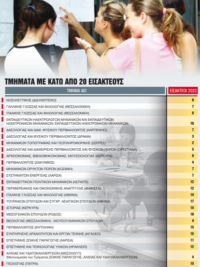 Σε αυτή την κατεύθυνση να υπενθυμίζουμε ότι το Τμήμα Δασολογίας και Διαχείρισης Φυσικού Περιβάλλοντος στο Καρπενήσι είχε φέτος επτά εισακτέους, το Τμήμα Δασολογίας και Διαχείρισης Περιβάλλοντος Φυσικών Πόρων στην Ορεστιάδα πέντε εισακτέους, το Τμήμα Γαλλικής Γλώσσας και Φιλολογίας του ΑΠΘ επτά εισακτέους, το Τμήμα Ιταλικής Γλώσσας του ίδιου ιδρύματος έξι εισακτέους, το Τμήμα Δασολογίας και Φυσικού Περιβάλλοντος Δράμας τρεις εισακτέους, το Τμήμα Μηχανικών Τοπογραφίας και Γεωπληροφορικής Σερρών δύο εισακτέους, το Τμήμα Αχρειολογίας Βιβλιοθηκονομίας και Μουσικολογίας Κέρκυρας εννέα εισακτέους, το Τμήμα Περιβάλλοντος Ζακύνθου τέσσερις εισακτέους, όπως και το τμήμα Αλιείας και Υδατοκαλλιεργειών στο Μεσολόγγι, το Τμήμα Μηχανικών Ορυκτών Πόρων στην Κοζάνη επτά εισακτέους, όπως και το Τμήμα Συστημάτων Ενέργειας Λάρισας.