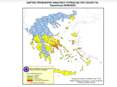 Σύμφωνα με το Χάρτη Πρόβλεψης Κινδύνου Πυρκαγιάς που εκδίδει η Γενική Γραμματεία Πολιτικής Προστασίας του Υπουργείου Εσωτερικών και Διοικητικής Ανασυγκρότησης, για αύριο Παρασκευή 5 Αυγούστου, προβλέπεται πολύ υψηλός κίνδυνος πυρκαγιάς (κατηγορία κινδύνου 4).
