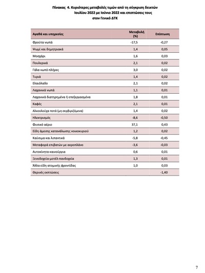 Η μείωση του Δείκτη Τιμών Καταναλωτή για τον Ιούλιο σε σχέση με τον Ιούλιο οφείλεται στην μείωση των φρούτων κατά 17,5%, του ηλεκτρικού κατά 17,5%, των καυσίμωνκατά 5,8%, ενώ αντίθετα αυξήθηκε το φυσικό αέριο κατά 37,1%.