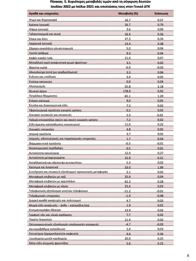 Οι μεγαλύτερες αυξήσεις εντοπίζονται στο φυσικό αέριο με 178,9%, στο ηλεκτρικό ρεύμα με 55,8% σε σχέση με τον αντίστοιχο μήνα πέρυσι, στα καύσιμα με 33%, στα λαχανικά με 13,4%, έλαια – λίπη με 27,3%, γαλακτοκομικά – αυγά 16,4%, μεταφορές με αεροπλάνο 62,3% και μεταφορές με πλοίο με 25,4%.