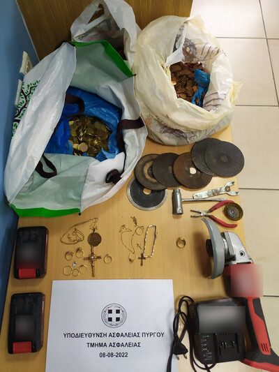 Ειδικότερα, οι αστυνομικοί της Υποδιεύθυνσης Ασφάλειας Πύργου, εντόπισαν σε στοχευμένο έλεγχο τον κατηγορούμενο να κινείται με αυτοκίνητο και σε έρευνα που του ενήργησαν βρήκαν στην κατοχή του και κατέσχεσαν τρεις σακούλες, που περιείχαν το χρηματικό ποσό των 1.705 ευρώ σε κέρματα αξίας από πέντε λεπτά του ευρώ μέχρι και δύο ευρώ, καθώς και πληθώρα εργαλείων εντός του οχήματός του, όπως ηλεκτρικό τροχό κοπής, δίσκοι κοπής μετάλλου, πένσα, μπουζόκλειδο και άλλα.