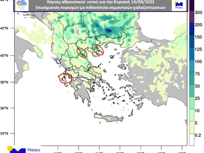Στον χάρτη που ακολουθεί εμφανίζεται το εκτιμώμενο συνολικό ύψος βροχόπτωσης για την Κυριακή 14/08, καθώς επίσης και οι περιοχές όπου αναμένονται σημαντικές χαλαζοπτώσεις.