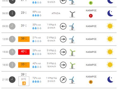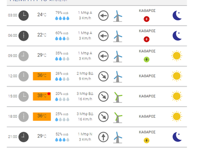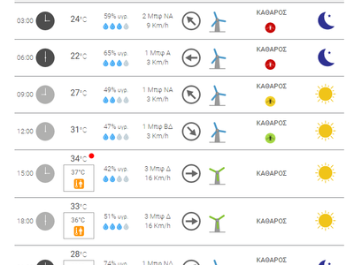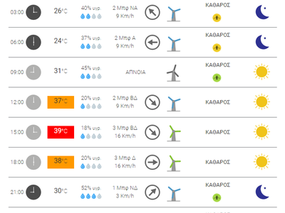 Θερμοκρασία: Από 18 έως 34 βαθμούς Κελσίου. Στη δυτική Μακεδονία 2 με 3 βαθμούς χαμηλότερη.