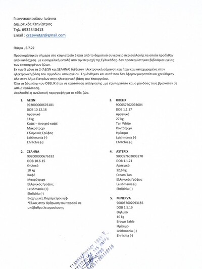 Προς επίρρωση όλων των ανωτέρω σας επισυνάπτουμε τα σχετικά έγγραφα καθώς και τις φωτογραφίες των κακοποιημένων ζώων.