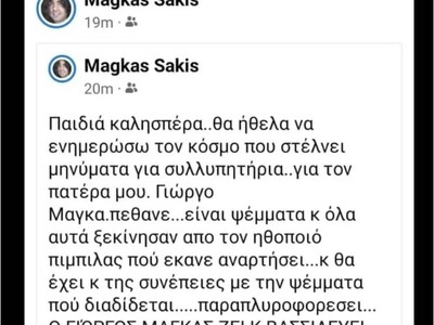 «Παιδιά καλησπέρα, θα ήθελα να ενημερώσω τον κόσμο που στέλνει μηνύματα και συλλυπητήρια για τον πατέρα μου ότι δεν πέθανε. Είναι ψέμματα και όλα αυτά ξεκίνησαν από τον ηθοποιό Μπιμπίλα που έκανε ανάρτηση. Θα έχει τις συνέπειες με τα ψέματα που διαδίδει. Παραπληροφόρηση. Ο Γιώργος Μάγκας ζει και βασιλεύει.