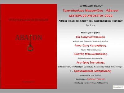 Οι Εκδόσεις Ραδάμανθυς παρουσιάζουν στην Πάτρα το βιβλίο του Τριαντάφυλλου Μασμανίδη – «Άβατον», τη Δευτέρα 29 Αυγούστου, στο Αίθριο του Παλαιού Δημοτικού Νοσοκομείου Πατρών, στις 8 το βράδυ.