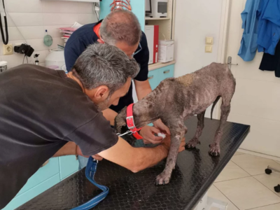Το σκυλί είναι το πολύ 8 μηνών. Ένα κουτάβι που δεν έχει αλλάξει ακόμη όλα του τα δόντια. Ένα μωρό μου έλιωνε από την σαρκοπτική ψώρα και την πείνα. Ένα μωρό σκυλάκι που κυκλοφορούσε σαν φάντασμα και κανένας δεν του έδινε σημασία . Εκτός από τα δύο μικρά κορίτσια... Υπήρχαν στιγμές που πάνω στο κτηνιατρικό τραπέζι δεν μπορούσε να σταθεί όρθιο. Από την αδυναμία.