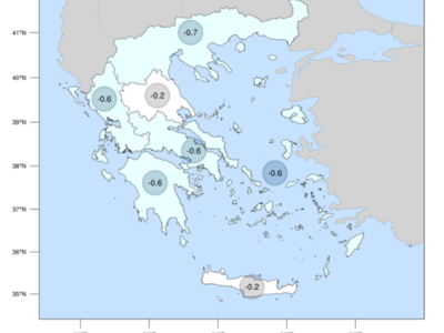 Κατά τον φετινό Αύγουστο 53 μετεωρολογικοί σταθμοί του Εθνικού Αστεροσκοπείου Αθηνών/meteo.gr κατέγραψαν αρνητικές αποκλίσεις της μέσης μέγιστης ημερήσιας θερμοκρασίας, οι οποίες παρουσιάζονται στον παρακάτω χάρτη.