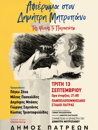 Με μία συναυλία φόρο τιμής στο Δημήτρη Μητροπάνο, έναν μοναδικό λαϊκό καλλιτέχνη και άνθρωπο, ο οποίος υπηρέτησε πιστά το μεγαλείο του λαϊκού τραγουδιού, μιλώντας μέσα από αυτό για δεκαετίες στην καρδιά εκατομμυρίων Ελλήνων, συνεχίζονται στις 9.00 το βράδυ της Τρίτης 13 Σεπτεμβρίου στο Παμπελοποννησιακό Στάδιο, ολοκληρώνονται οι εκδηλώσεις του Διεθνούς Φεστιβάλ Πάτρας.