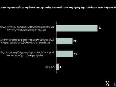 Σε σχέση με το κυρίαρχο θέμα της περιόδου, δηλαδή τις παρακολουθήσεις, η στάση της κοινής γνώμης είναι σαφής: για την πλειοψηφία της κοινωνίας «κακώς» έγιναν οι παρακολουθήσεις και πλήττουν τη Δημοκρατία (54%).