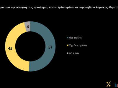 Για πρώτη φορά από την αρχή του εκλογικού κύκλου, ένα οριακά πλειοψηφικό ρεύμα (51%) εκτιμάει ότι ο Κυριάκος Μητσοτάκης θα πρέπει να παραιτηθεί.