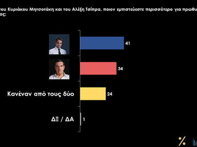 Ο Κυριάκος Μητσοτάκης (41%) υπερτερεί του αρχηγού της αξιωματικής αντιπολίτευσης Αλέξη Τσίπρα (34%) στο bras de fer της εμπιστοσύνης για το αξίωμα του πρωθυπουργού