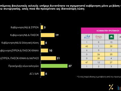 Ως προς τα επιθυμητά σενάρια για σχηματισμό κυβέρνησης, οι ψηφοφόροι της ΝΔ είναι σαφείς: συγκυβέρνηση με το ΠΑΣΟΚ/ΚΙΝΑΛ ή προκήρυξη πρόωρων εκλογών. Ακόμα πιο ξεκάθαροι είναι οι ψηφοφόροι του ΣΥΡΙΖΑ: Συγκυβέρνηση με μη δεξιές δυνάμεις, η οποία – ιδανικά – θα πλαισιώνεται και από το ΜεΡΑ25. Αντίθετα, οι ψηφοφόροι του ΠΑΣΟΚ/ΚΙΝΑΛ μοιάζουν πιο διχασμένοι: Το 30% αυτών προτιμάει μια συγκυβέρνηση με τη ΝΔ, ενδεχομένως όχι όμως υπό την ηγεσία του Κυριάκου Μητσοτάκη, το 24% με τις προοδευτικές δυνάμεις και κατά προτίμηση χωρίς το ΜεΡΑ25, ενώ το 27% προκήρυξη νέων εκλογών.