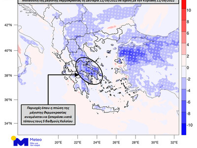 Στον σχετικό χάρτη που ακολουθεί παρουσιάζεται η μεταβολή της μέγιστης θερμοκρασίας που αναμένεται τη Δευτέρα 12/09 σε σχέση με τη μέγιστη θερμοκρασία της Κυριακής 11/09.
