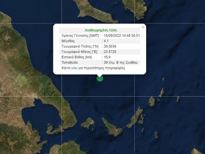 Σύμφωνα με την πρώτη εκτίμηση του Γεωδυναμικού Ινστιτούτου του Αστεροσκοπείου της Αθήνας, ο σεισμός στη Σκιάθο είχε ένταση 4,1 Ρίχτερ.
