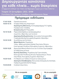 Tο Κοινωφελές Σωματείο Φροντίζω σε συνεργασία με τον Α.Σ.Π Προμηθέα, την Περιφέρεια Δυτικής Ελλάδος και το Κέντρο Στήριξης Παιδιού & Οικογένειας των Παιδικών Χωριών SOS στην Πάτρα οργανώνουν ενημερωτική εκδήλωση με τίτλο: «Δημιουργώντας κοινότητες για κάθε ηλικία… χωρίς διακρίσεις».