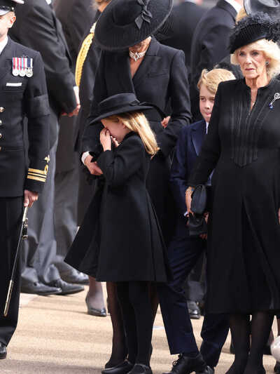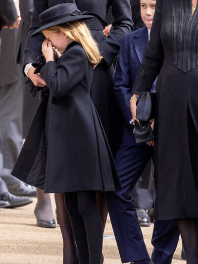 Η πριγκίπισσα Σάρλοτ έφτασε στο Αβαείο του Ουεστμινστερ μαζί με την μητέρα της, τον αδερφό της πρίγκιπα Τζόρτζ και τη βασιλική σύζυγο Καμίλα. Η επτάχρονη κόρη του Ουίλιαμ και της Κέιτ ήταν ντυμένη στα μαύρα, φορώντας ακόμα και καπέλο, όπως ακριβώς και η μητέρα της. Το μοναδικό στοιχείο που «έσπαγε» την μονοχρωμία, ήταν μια διαμαντένια καρφίτσα που είχε το σχήμα πετάλου.