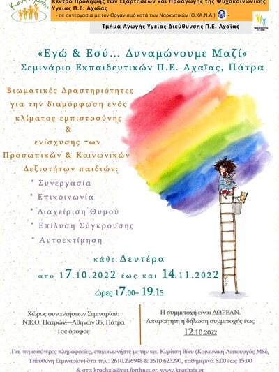 Το Σεμινάριο πρόκειται να υλοποιηθεί ημέρα Δευτέρα, από 17.10.2022 έως και 14.11.2022 και ώρες 17.00-19.15 στα χώρο του Κέντρου Πρόληψης Αχαΐας. Στους συμμετέχοντες θα δοθεί σχετική Βεβαίωση Επιμόρφωσης. Οι εκπαιδευτικοί που επιθυμούν να συμμετέχουν, μπορούν να δηλώσουν το ενδιαφέρον τους στον σύνδεσμο: https://forms.gle/RR1e62kvii4z9RKr8 μέχρι την Τετάρτη 12 Οκτωβρίου 2022.