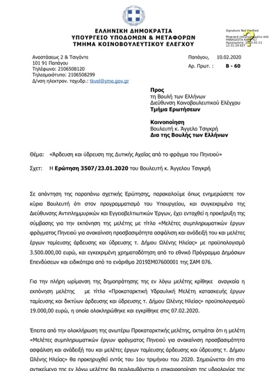 Σε ανακοίνωση του βουλευτή Αχαΐας της Νέας Δημοκρατίας Άγγελου Τσιγκρή αναφέρεται: "Ευχάριστα νέα προκύπτουν έπειτα από τη σχετική Ερώτηση του βουλευτή Αχαΐας της ΝΔ Άγγελου Τσιγκρή προς το Υπουργείο Υποδομών και Μεταφορών (Αριθμός Πρωτοκόλλου Ερώτησης: 3507 / 23.01.2020) σχετικά με την «άρδευση και ύδρευση της Δυτικής Αχαΐας από το φράγμα του Πηνειού».