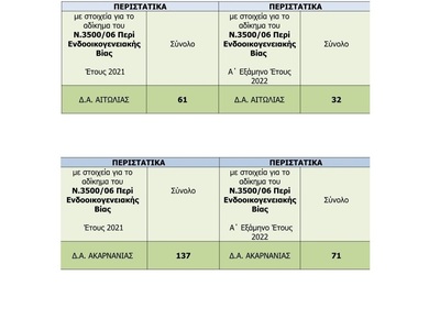 Ακολουθούν παρακάτω τα στατιστικά στοιχεία για υποθέσεις ενδοοικογενειακής βίας, στις οποίες έχουν επιληφθεί οι αστυνομικές Υπηρεσίες των Διευθύνσεων Αστυνομίας Ακαρνανίας και Αιτωλίας για το 2021 και για το α’ εξάμηνο του 2022 (τα στοιχεία προέρχονται απο την Γενική Αστυνομική Διεύθυνση Δυτικής Ελλάδος, κατόπιν αιτήματος του agriniopress):