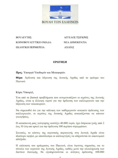 Στο πλαίσιο του κοινοβουλευτικού ελέγχου, ο βουλευτής Αχαΐας της Νέας Δημοκρατίας Άγγελος Τσιγκρής, κατέθεσε Ερώτηση προς τον Υπουργό Υποδομών και Μεταφορών, με την οποία ζητά την άρδευση και την ύδρευση της Δυτικής Αχαΐας από το φράγμα του Πηνειού.