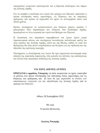 Συγκεκριμένα, ο Αχαιός βουλευτής ρωτάει τον Υπουργό Υποδομών και Μεταφορών: α) πότε αναμένεται να έχουν εκπονηθεί οι μελέτες των έργων συντήρησης και επέκτασης στους ταμιευτήρες και τις διώρυγες του φράγματος και β) πότε θα έχει περατωθεί το σύνολο των απαιτούμενων ενεργειών για την υδροδότηση της Δυτικής Αχαΐας από το φράγμα του Πηνειού.