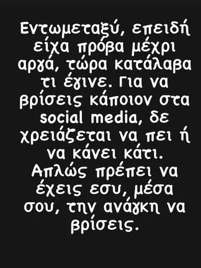 Στη συνέχεια έγραψε πως ανήκει μόνο στις γάτες του και πουθενά αλλού και τόνισε «Εν τω μεταξύ, επειδή είχα πρόβα μέχρι αργά, τώρα κατάλαβα τι έγινε. Για να βρίσεις κάποιον στα social media, δεν χρειάζεται να πει ή να κάνει κάτι. Απλώς, πρέπει να έχεις εσύ, μέσα σου, την ανάγκη να τον βρίσεις».