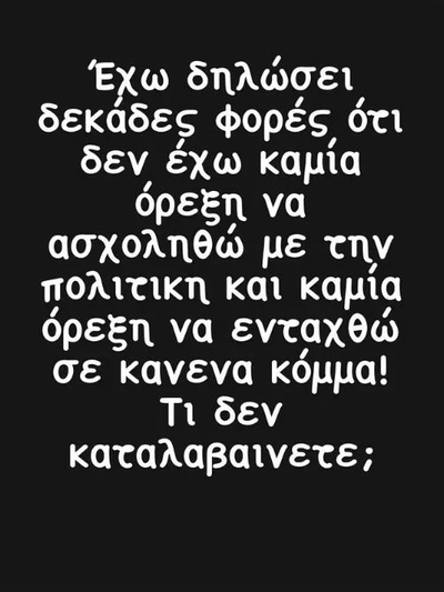 «Έχω δηλώσει δεκάδες φορές ότι δεν έχω καμία όρεξη να ασχοληθώ με την πολιτική και καμία όρεξη να ενταχθώ σε κανένα κόμμα. Τι δεν καταλαβαίνετε;», έγραψε αρχικά.