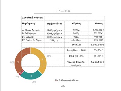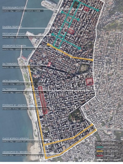 Το ενδεικτικό κόστος των παρεμβάσεων έχει υπολογιστεί σε διακριτά τμήματα ανά παρέμβαση έτσι ώστε να είναι εύκολο να προτεραιοποιηθούν οι αναπλάσεις και να γίνει ένας μεσοπρόθεσμος προγραμματισμός ανά φάση έργου. Για την κάθε παρέμβαση έχουν χρησιμοποιηθεί άρθρα από ΑΤΟΕ και ΑΤΕΠ έτσι ώστε να γίνει μια προσέγγιση κόστους με πολύ μεγάλη ακρίβεια έχοντας λάβει υπόψιν τις εργασίες που θα προκύψουν στην κάθε περίπτωση. Όσον αφορά τις παρεμβάσεις Α και Β, λόγω του ότι αποτελούν λωρίδες σταθερής διατομής, έχει υπολογιστεί το κόστος τους ανά τρέχον μέτρο. Έτσι γνωρίζοντας το μήκος της εκάστοτε οδού γίνεται και ο υπολογισμός του κόστους. Για την παρέμβαση Γ έχει γίνει υπολογισμός ανά τετραγωνικό μέτρο, με διακριτές περιπτώσεις για τις σχολικές μονάδες και τους δύο σιδηροδρομικούς σταθμούς. Για τα σχολεία έχει υπολογιστεί φύτευση 1 δέντρο/5μ. περιμετρικά του προαυλίου ενώ για τους σταθμούς έχει τεθεί συντελεστής φυτοκάλυψης 0.5 επί του συνολικού εμβαδού. Τα προτεινόμενα κοστολόγια έχουν ώς εξής: