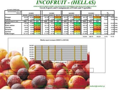 Στο μεταξύ συνεχίζεται η συγκομιδή και εξαγωγή επιτραπεζίων σταφυλιών με υποτονικούς ρυθμούς. Οι εξαγωγές τους ανέρχονται σε 26.022 τόνους μειωμένες κατά 33,6% έναντι του 2021 και κατά 40,2% έναντι της αντίστοιχης περιόδου 2020.