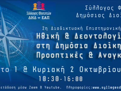 Μετά την επιτυχημένη επιστημονική ημερίδα που διοργάνωσε ο Σύλλογος Φοιτητών Δημόσιας Διοίκησης του ΕΑΠ τον περασμένο Φεβρουάριο με θέμα: «Δημόσια Διοίκηση και Ψηφιακή Διακυβέρνηση», έρχεται η διοργάνωση μίας νέας, διημερίδας αυτή τη φορά, που σκοπό έχει την ενημέρωση, την ανταλλαγή απόψεων και τη διεύρυνση των οπτικών μας πάνω σε ένα εξαιρετικά σημαντικό και ενδιαφέρον θέμα.