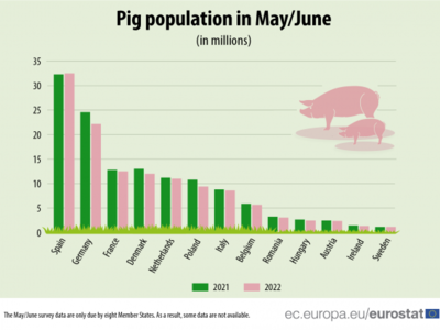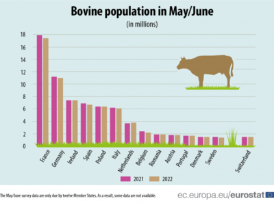 Συγκεκριμένα, σύμφωνα με τα στοιχεία της Eurostat, τα οποία αντλήθηκαν από κράτη μέλη, τα οποία έχουν τουλάχιστον 1,5 εκατ. βοοειδή ή/και 3 εκατ. χοίρους, τον Μάιο/Ιούνιο 2022, ο πληθυσμός των βοοειδών έχει μειωθεί κατά 2% και ο πληθυσμός των χοίρων κατά 5% σε σύγκριση με την ίδια περίοδο του 2021.