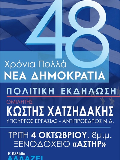 Πολιτική εκδήλωση με τίτλο «48 Χρόνια Πολλά Νέα Δημοκρατία» διοργανώνει η ΔΕΕΠ Αχαΐας - Διοικούσα Επιτροπή Εκλογικής Περιφέρειας Ν.Δ. Αχαΐας, την Τρίτη 4 Οκτωβρίου 2022 στις 8 το βράδυ στο ξενοδοχείο Αστήρ, στην Πάτρα όπου έχει προσκληθεί να παραστεί και να μιλήσει ο Κωστής Χατζηδάκης, Υπουργός Εργασίας και αντιπρόεδρος της ΝΔ.