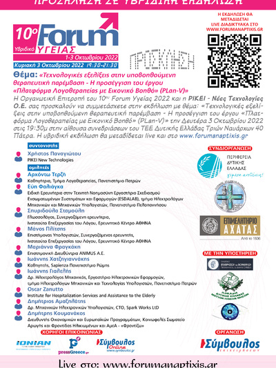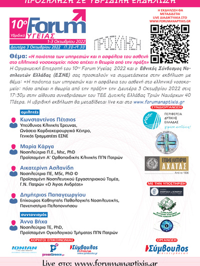Το «10ο Forum Υγείας» πραγματοποιείται το χρονικό διάστημα 1-3 Οκτωβρίου 2022 και είναι υβριδικό. Οι εκδηλώσεις όπως αναφέρει η σχετική ανακοίνωση, διεξάγονται με φυσικό τρόπο και ταυτόχρονα προβάλλονται live διαδικτυακά αξιοποιώντας την υψηλή τεχνογνωσία μετάδοσης μέσω της πλατφόρμας www.forumanaptixis.gr.