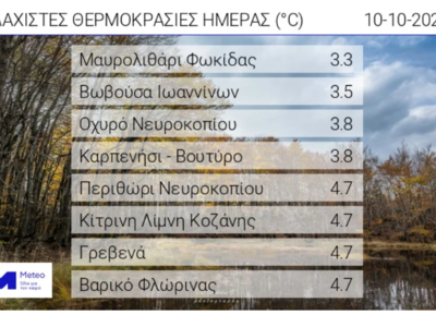 Η χαμηλότερη θερμοκρασία καταγράφηκε στο Μαυρολιθάρι Φωκίδας και ήταν ίση με 3.3 βαθμούς Κελσίου. Οι 8 σταθμοί του δικτύου που κατέγραψαν τις χαμηλότερες θερμοκρασίες τη Δευτέρα 10/10 παρουσιάζονται στον πίνακα που ακολουθεί: