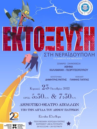 Το Θεατρικό Εργαστήρι της Πολυφωνικής Χορωδίας της Πάτρας - τμήμα ενηλίκων θα παρουσιάσει την παράσταση με τίτλο «Εκτόξευση στη Νεραϊδούπολη» την Κυριακή 23 Οκτωβρίου 2022 στις 5:30 μ.μ. και στις 7:30 μ.μ. στο Δημοτικό Θέατρο Απόλλων στην πλ. Γεωργίου Α’.