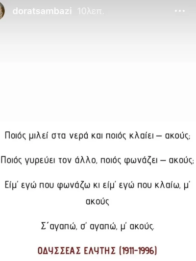 «Ποιός μιλεί στα νερά και ποιός κλαίει – ακούς; Ποιός γυρεύει τον άλλο, ποιός φωνάζει – ακούς; Είμ’ εγώ που φωνάζω κι είμ’ εγώ που κλαίω, μ’ ακούς. Σ΄αγαπώ, σ’ αγαπώ, μ’ ακούς», ανέφερε η ανάρτηση που δημοσίευσε σε ιστορία στο Instagram.